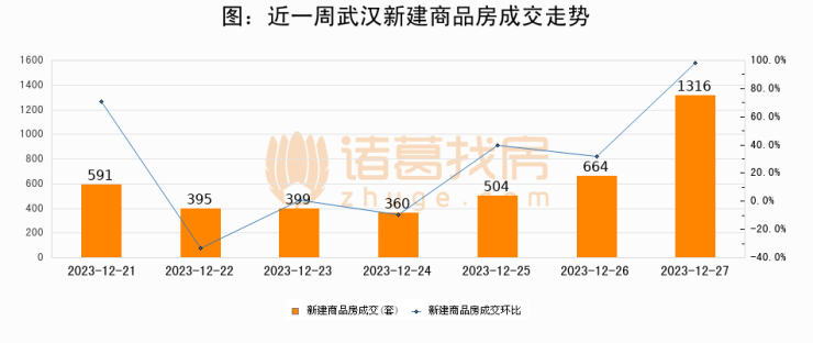 根据武汉市住房保障和房屋管理局数据显示,2023年12月27日武汉新建商品房成交1316套,较昨日增加652套,环比上涨98.2%