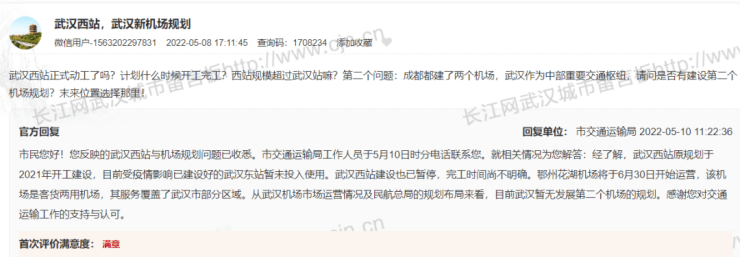市交通运输局:市民您好!您反映的武汉西站与机场规划问题已收悉。市交通运输局工作人员于5月10日时分电话联系您。就相关情况为您解答:经了解,武汉西站原规划于2021年开工建设,目前受疫情影响已建设好的武汉东站暂未投入使用。武汉西站建设也已暂停,完工时间尚不明确。鄂州花湖机场将于6月30日开始运营,该机场是客货两用机场,其服务覆盖了武汉市部分区域。从武汉机场市场运营情况及民航总局的规划布局来看,目前武汉暂无发展第二个机场的规划。感谢您对交通运输工作的支持与认可。
