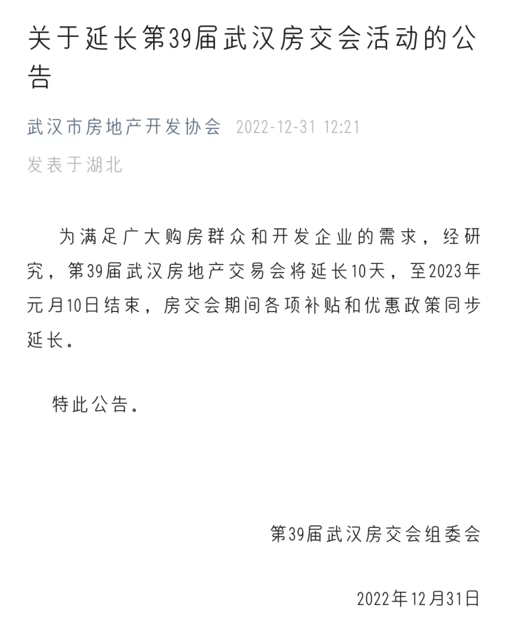 12月31日消息,记者从武汉房交会组委会获悉,为满足广大购房群众和开发企业的需求,第39届武汉房地产交易会将延长10天,至2023年1月10日结束,房交会期间各项补贴和优惠政策同步延长。