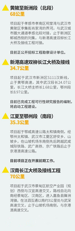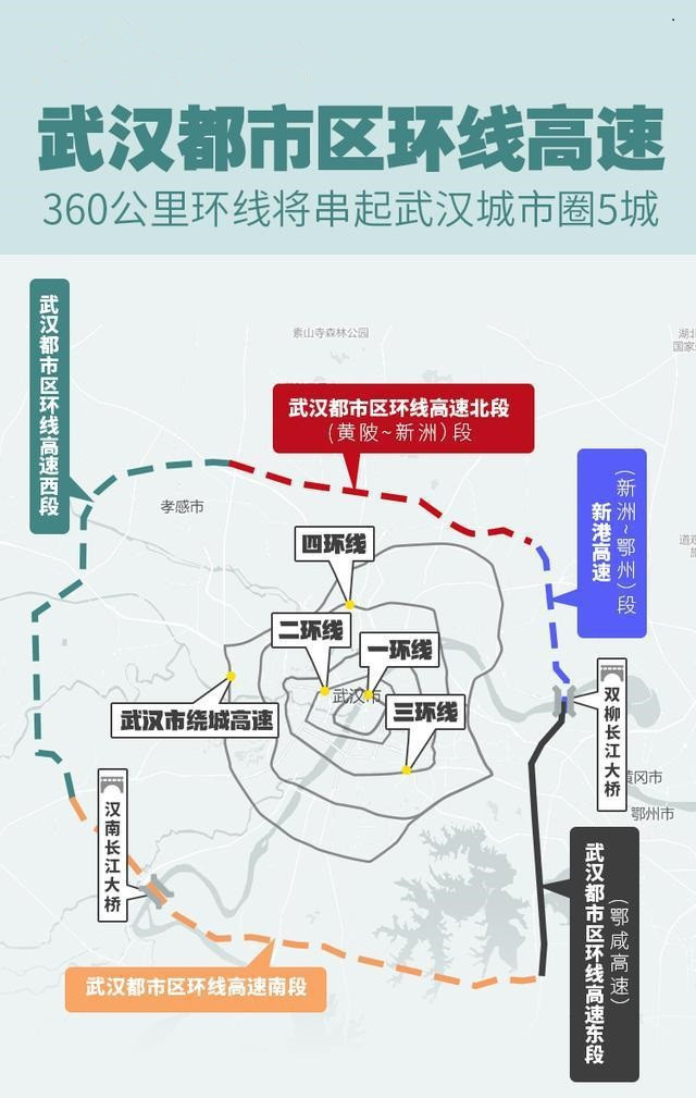 2月1日, 记者从武汉市交通运输局了解到,武汉都市区环线高速项目全长约360公里,位于武汉绕城高速公路和武汉城市圈环线高速之间。新建项目工程分为东、南、西、北4个路线段及新港高速公路双柳长江大桥、汉南长江大桥两座长江大桥建设。