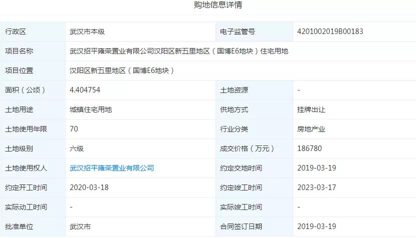 天眼查上还显示武汉市招平雍荣置业有限公司(即项目开发公司)购地国博新城E6地块,预计竣工时间2023年。