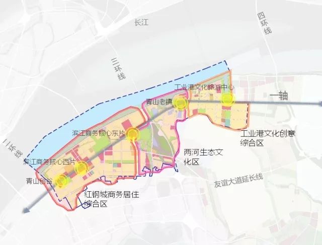 充分发挥滨江优势,围绕“一轴三区五心”,有机融合创新元素、商业元素和文化元素。沿江依次打造红钢城商务居住区、两河生态文化区、工业港文化创意综合区。构筑和平大道-化工大道沿线长江发展轴,串联主要的功能区与功能节点,包括青山创谷、青山滨江商务区核心西片、青山滨江商务区核心东片、青山老镇、工业港文化旅游中心、建设新城文化创意中心。