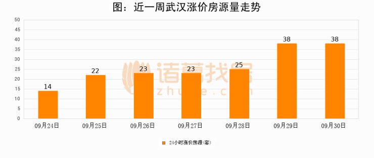 根据诸葛找房数据显示,武汉24小时涨价房源量为38套,较09月29日持平。