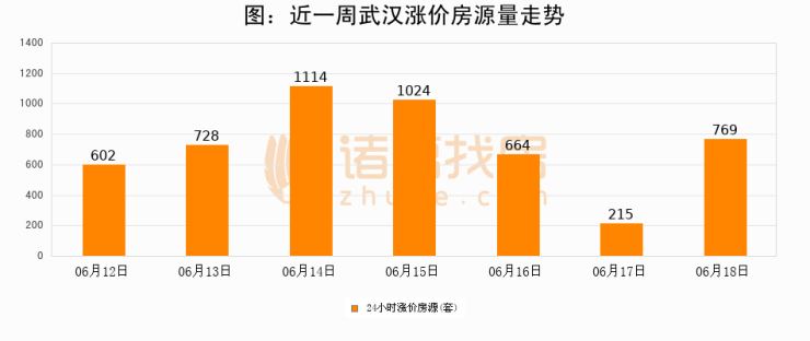 根据诸葛找房数据显示,武汉24小时涨价房源量为769套,较06月17日增加554套,环比上涨257.7%。与此同时,涨价房源占比小幅扩大,业主信心有所提升。