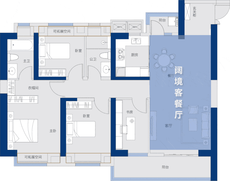 在户型空间的设计上,四开间朝南尽揽东湖春光,40㎡的客餐厅和超6米的大阳台,处处显露出“阔气”之感。留出灵活拓展空间,可百变创意,让居所陪伴成长。