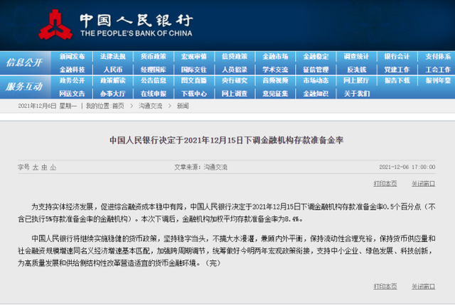 12月6日消息,搜狐焦点获悉,为支持实体经济发展,促进综合融资成本稳中有降,中国人民银行决定于2021年12月15日下调金融机构存款准备金率0.5个百分点(不含已执行5%存款准备金率的金融机构)。本次下调后,金融机构加权平均存款准备金率为8.4%。