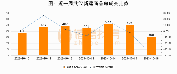 根据武汉市住房保障和房屋管理局数据显示,2023年10月16日武汉新建商品房成交308套,较昨日减少197套,环比下降39%