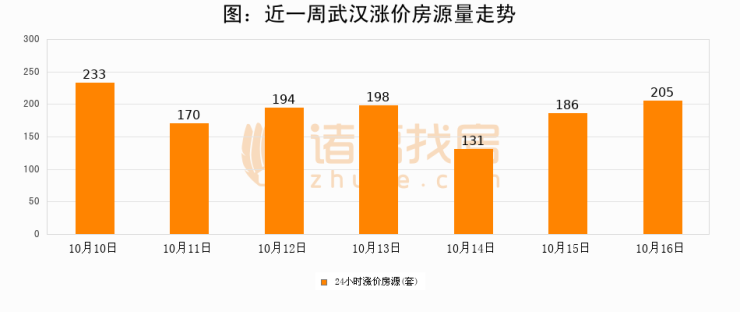 根据诸葛找房数据显示,武汉24小时涨价房源量为205套,较10月15日增加19套,环比上涨10.2%。与此同时,涨价房源占比小幅扩大,业主信心有所提升。