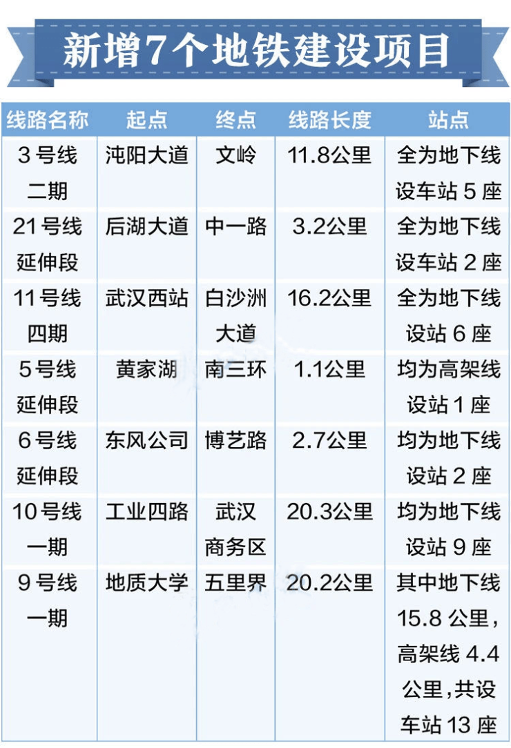 11号线四期:起于11号线汉阳站,止于江安路站,线路全长16.2km,全地下敷设方式,设车站6座,其中换乘站5座,续建汤山车辆段。