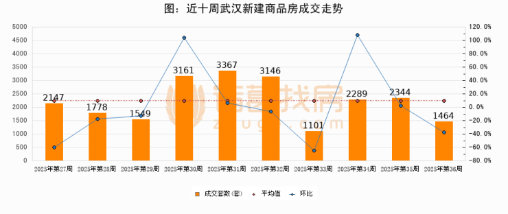 进入2025年第36周(09月01日-09月07日),武汉新建商品房成交1464套,较上周减少880套,环比下降37.5%