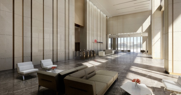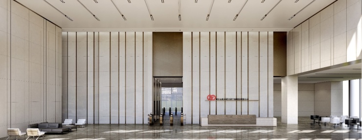 7.2米挑高大堂,搭配纯色净面天花、雪白色可丽耐透光石镂墙面,配合现代极简线条,简约中更显大气,彰显十足的艺术商务风。