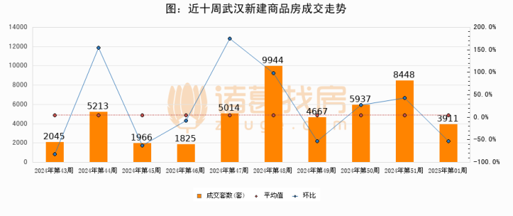 进入2025年第01周(12月30日-01月05日),武汉新建商品房成交3911套,较上周减少4537套,环比下降53.7%