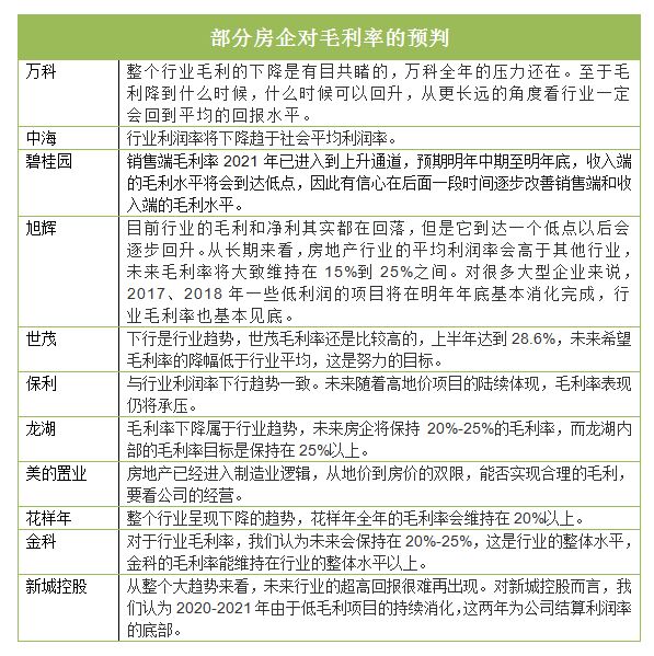 在国家稳房价、稳地价、稳预期长效机制的引导下,行业一定会走向平稳健康的发展,进入全方位高强度的竞争,所以目前行业的毛利和净利其实都在回落,但是它到达一个低点以后会逐步回升。