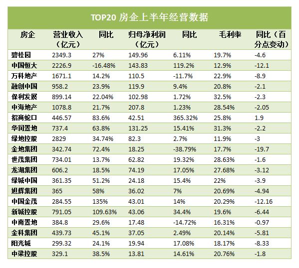 碧桂园今年上半年毛利率亦显示跌破20%,毛利率为19.7%,同比降4.6个百分点。以TOP20房企公布的经营数据计算,前20强房企的平均毛利率为20.9%,其中7家房企的毛利率低于20%;11家房企的毛利率在20%~30%之间;仅保利发展和华润置地两家房企的毛利率维持在30%以上。房企也不得不认清现实:“房地产已经进入制造业逻辑,从地价到房价的双限,能否实现合理的毛利,要看公司的经营。”