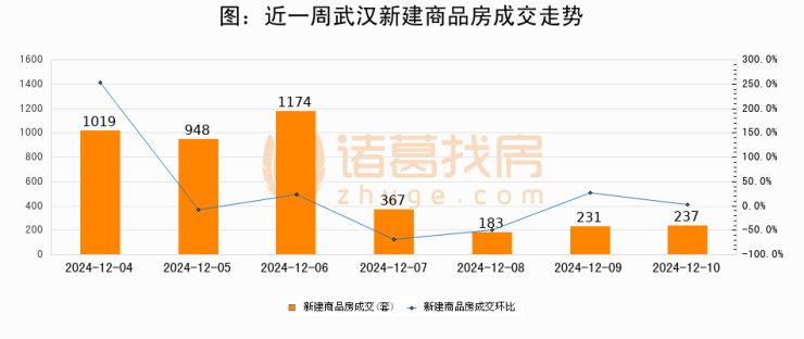 根据武汉市住房保障和房屋管理局数据显示,2024年12月10日武汉新建商品房成交237套,较昨日增加6套,环比上涨2.6%