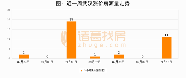 根据诸葛找房数据显示,武汉24小时涨价房源量为11套,较09月09日增加11套,环比上涨0%。与此同时,涨价房源占比小幅扩大,业主信心有所提升。