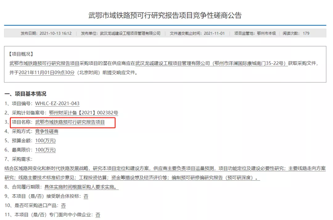 10月13日,《武鄂市域铁路预可行研究报告项目竞争性磋商公告》发布。