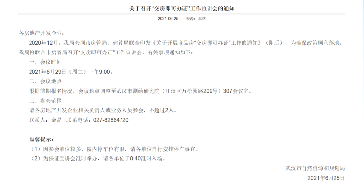 武汉市不动产登记中心相关负责人介绍,6月29日召开的宣讲会旨在增强各房地产开发企业对政策的理解,以确保政策扎实推进、有效落地。7月1日起,“交房即办证”政策将在武汉市全面铺开。