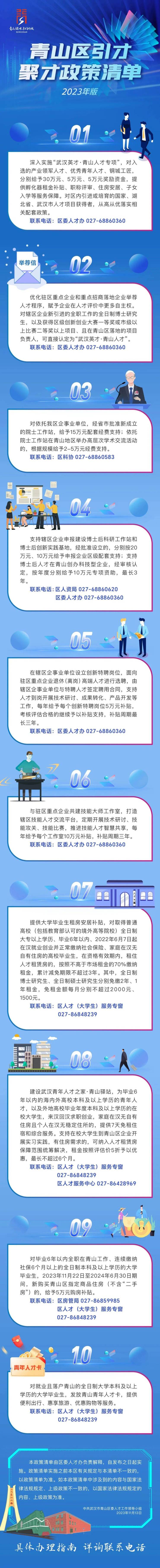 为贯彻落实中央和省市关于人才工作部署要求,深入实施人才强区战略,吸引集聚大批高素质人才,加快建设现代化青山绿水红钢城,青山区聚焦人才痛点需求,学习借鉴先进经验做法,优化整合现有人才政策,制定出台了青山区引才聚才政策清单(2023年版)。