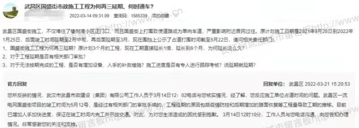 武昌区一流电网国盛街项目的竣工时间为5月12号,是经过有相关部门的审批手续的,工程延期的原因包括疫情防控和后期增加的路面恢复等工程量导致工期的推移。目前已增加人手加快进度,保证在竣工时间内完工并开放交通。