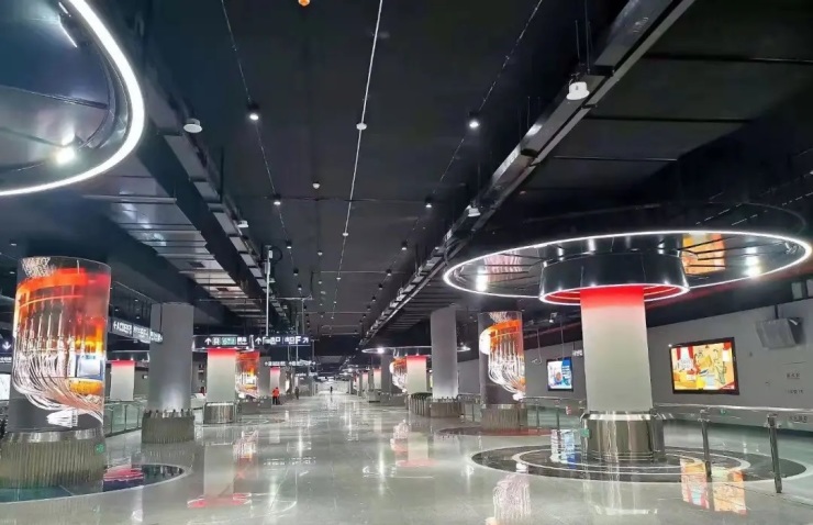站厅中,每个柱体的艺术造型不尽相同。有的造型仿佛飞船悬停,有的如同发射塔,有的又采用曲面LED屏技术打造成光柱,结合柱脚艺术玻璃展示,变化万千,光彩各异。配合灯光巧妙的渲染,为站厅空间营造出科技感及未来之城的氛围。