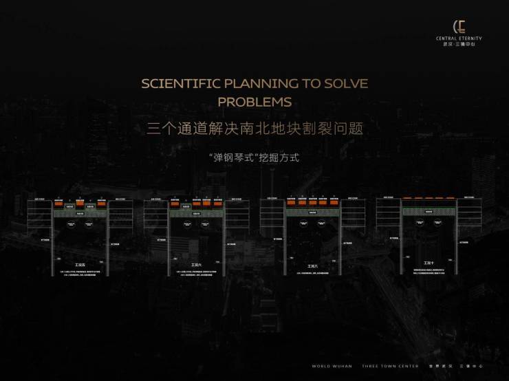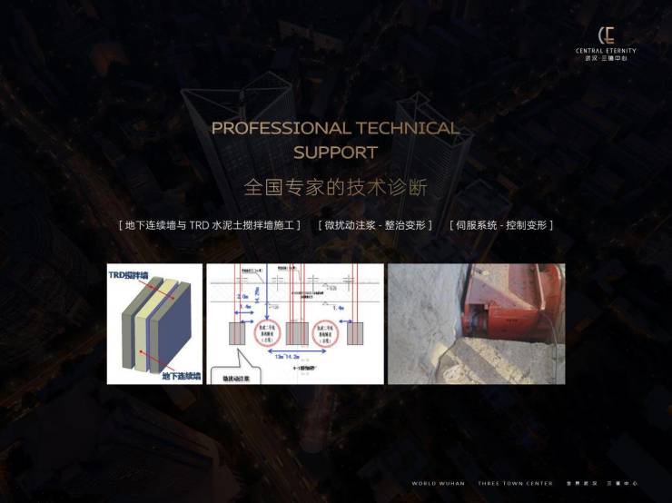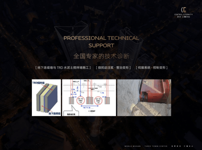 在施工建设层面,武汉·三镇中心采用“弹钢琴式”挖掘方式,以三通道作业解决南北地块割裂造城的施工问题;在全国专家的研究下,采用地下连续墙与TRD水泥搅拌墙施工,微扰动注浆,伺服系统等先进技术,克服地铁及地下管网带来的施工难题,在不对地铁及管网造成影响的前提下推动项目建设。
