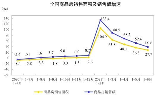 1—6月份,商品房销售面积88635万平方米,同比增长27.7%;比2019年1—6月份增长17.0%,两年平均增长8.1%。其中,住宅销售面积增长29.4%,办公楼销售面积增长10.0%,商业营业用房销售面积增长5.7%。商品房销售额92931亿元,增长38.9%;比2019年1—6月份增长31.4%,两年平均增长14.7%。其中,住宅销售额增长41.9%,办公楼销售额增长10.7%,商业营业用房销售额增长8.8%。
