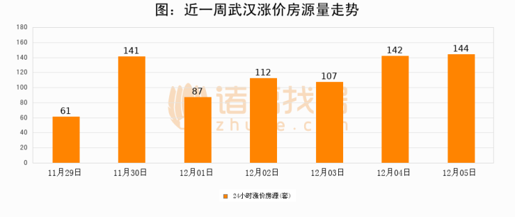 根据诸葛找房数据显示,武汉24小时涨价房源量为144套,较12月04日增加2套,环比上涨1.4%。与此同时,涨价房源占比小幅扩大,业主信心有所提升。