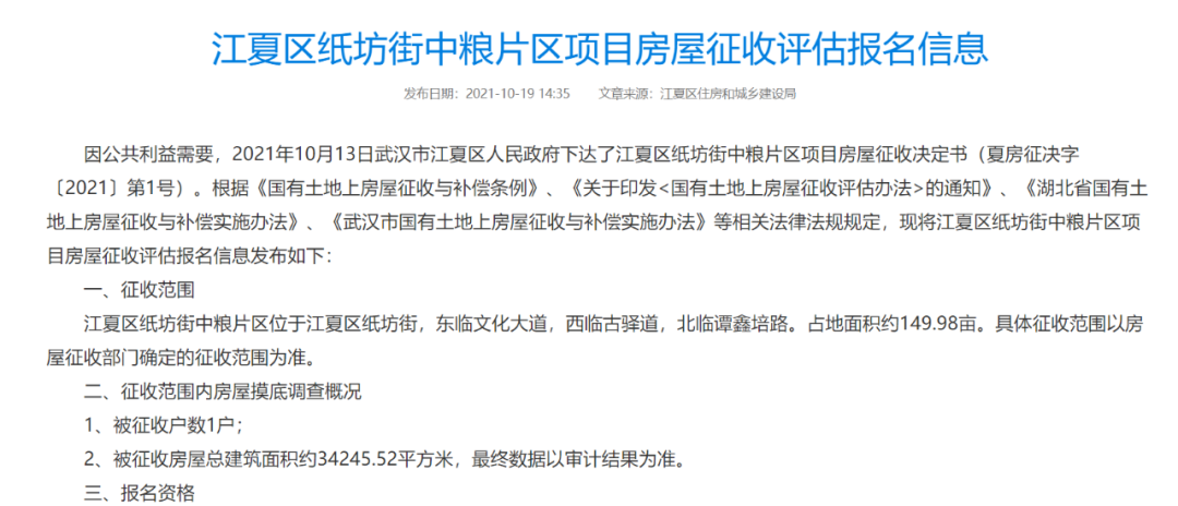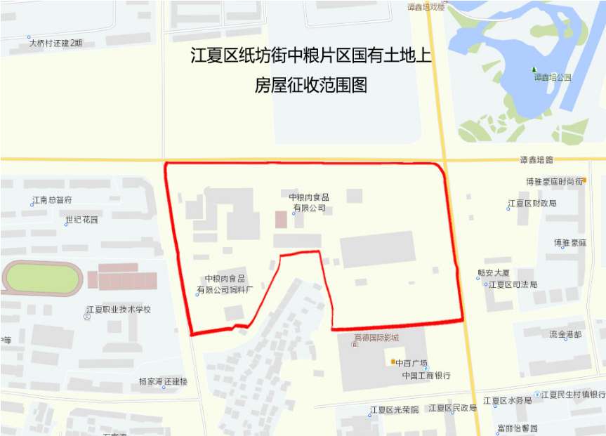 一、征收范围:江夏区纸坊街中粮片区位于江夏区纸坊街,东临文化大道,西临古驿道,北临谭鑫培路。占地面积约149.98亩。具体征收范围以房屋征收部门确定的征收范围为准。