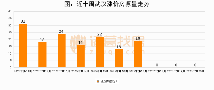 从调价房源来看,第20周武汉涨价房源0套,较上周持平。与此同时,20周涨价房源占比持平