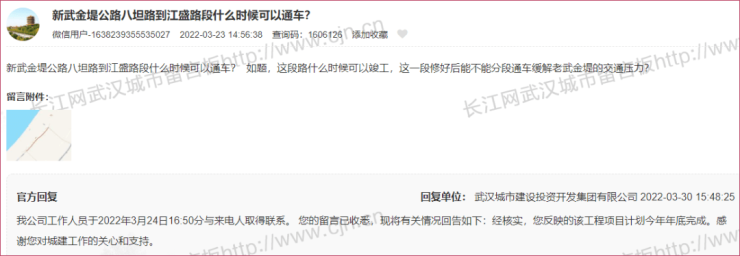 近日,有居民在城市留言板上咨询:新武金堤公路八坦路到江盛路段什么时候可以通车?如题,这段路什么时候可以竣工,这一段修好后能不能分段通车缓解老武金堤的交通压力?