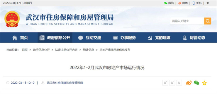 3月17日消息,搜狐焦点获悉,武汉市住房保障和房屋管理局公布2022年1-2月武汉市房地产市场运行情况。