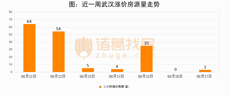 根据诸葛找房数据显示,武汉24小时涨价房源量为3套,较08月26日增加3套,环比上涨0%。与此同时,涨价房源占比小幅扩大,业主信心有所提升。