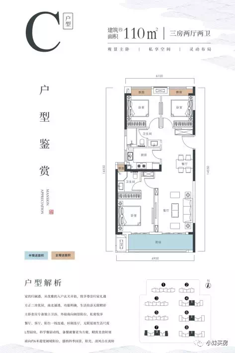 110平米三房两卫户型:边户,南北向,采光好,私密性强,南面是一个接近6米宽的大阳台,非常实用,厨餐厅相隔较近,备餐取餐方便,该户型主卧私密性也很好!