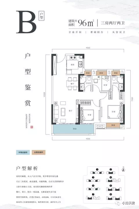 96平米三房两厅两卫:中间连廊户,保证了一定的通风采光效果,户型方正,动静分区,南向阳台很大,同时飘窗多,赠送面积多,最难得的是96平做了三房两卫,面积不大,控制了总价,但功能性却很强!