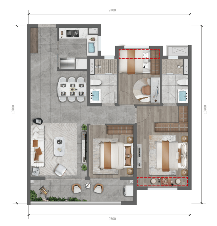 龙湖·天璞建面约106㎡的户型,突破传统客厅尺度,三开间朝南,拥有难得一见的约9.7米大面宽,阳光清风自然流动,视野无限延伸。